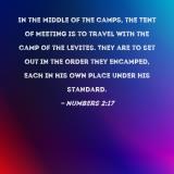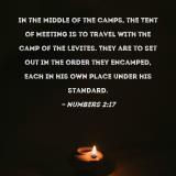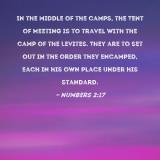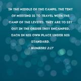 In the middle of the camps, the Tent of Meeting is to travel with the camp of the Levites. They are to set out in the order they encamped, each in his own place under his standard.