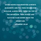After Moses had removed Aaron's garments and put them on his son Eleazar, Aaron died there on top of the mountain. Then Moses and Eleazar came down from the mountain.