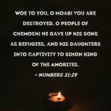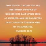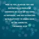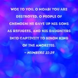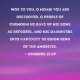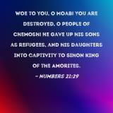 Woe to you, O Moab! You are destroyed, O people of Chemosh! He gave up his sons as refugees, and his daughters into captivity to Sihon king of the Amorites.