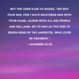 But the LORD said to Moses, "Do not fear him, for I have delivered him into your hand, along with all his people and his land. Do to him as you did to Sihon king of the Amorites, who lived in Heshbon."