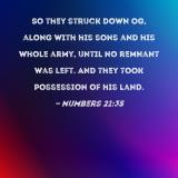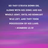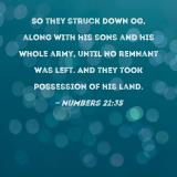 So they struck down Og, along with his sons and his whole army, until no remnant was left. And they took possession of his land.