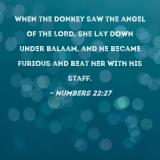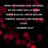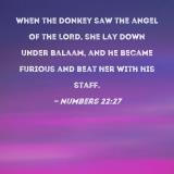 When the donkey saw the angel of the LORD, she lay down under Balaam, and he became furious and beat her with his staff.