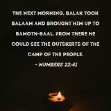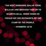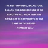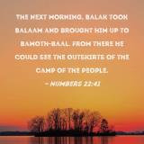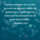 The next morning, Balak took Balaam and brought him up to Bamoth-baal. From there he could see the outskirts of the camp of the people.