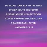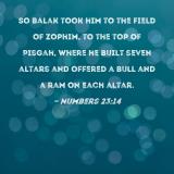 So Balak took him to the field of Zophim, to the top of Pisgah, where he built seven altars and offered a bull and a ram on each altar.