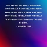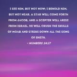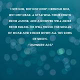 I see him, but not now; I behold him, but not near. A star will come forth from Jacob, and a scepter will arise from Israel. He will crush the skulls of Moab and strike down all the sons of Sheth.