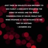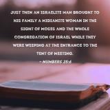 Just then an Israelite man brought to his family a Midianite woman in the sight of Moses and the whole congregation of Israel while they were weeping at the entrance to the Tent of Meeting.