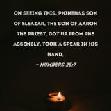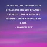 On seeing this, Phinehas son of Eleazar, the son of Aaron the priest, got up from the assembly, took a spear in his hand,