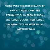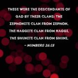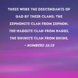These were the descendants of Gad by their clans: The Zephonite clan from Zephon, the Haggite clan from Haggi, the Shunite clan from Shuni,