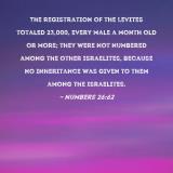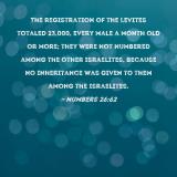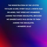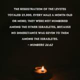 The registration of the Levites totaled 23,000, every male a month old or more; they were not numbered among the other Israelites, because no inheritance was given to them among the Israelites.