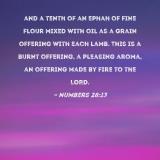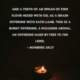 and a tenth of an ephah of fine flour mixed with oil as a grain offering with each lamb. This is a burnt offering, a pleasing aroma, an offering made by fire to the LORD.