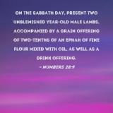 On the Sabbath day, present two unblemished year-old male lambs, accompanied by a grain offering of two-tenths of an ephah of fine flour mixed with oil, as well as a drink offering.