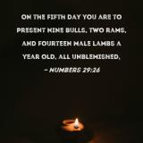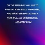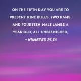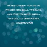 On the fifth day you are to present nine bulls, two rams, and fourteen male lambs a year old, all unblemished,