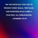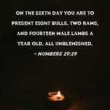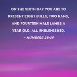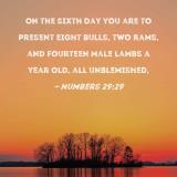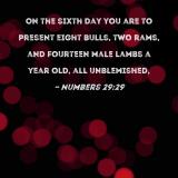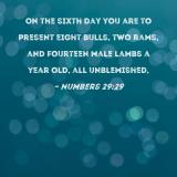 On the sixth day you are to present eight bulls, two rams, and fourteen male lambs a year old, all unblemished,
