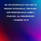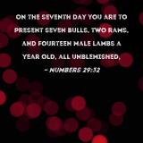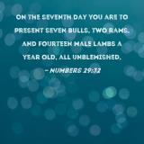 On the seventh day you are to present seven bulls, two rams, and fourteen male lambs a year old, all unblemished,