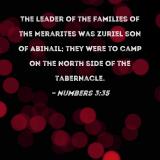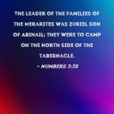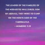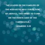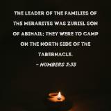 The leader of the families of the Merarites was Zuriel son of Abihail; they were to camp on the north side of the tabernacle.