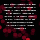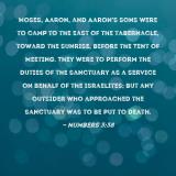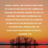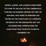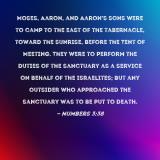 Pictures and Artwork Moses, Aaron, and Aaron's sons were to camp to the east of the tabernacle, toward the sunrise, before the Tent of Meeting. They were to perform the duties of the sanctuary as a service on behalf of the Israelites; but any outsider who approached the sanctuary was to be put to death. |