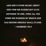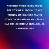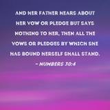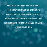 and her father hears about her vow or pledge but says nothing to her, then all the vows or pledges by which she has bound herself shall stand.