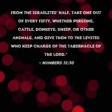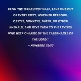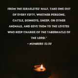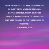 From the Israelites' half, take one out of every fifty, whether persons, cattle, donkeys, sheep, or other animals, and give them to the Levites who keep charge of the tabernacle of the LORD."