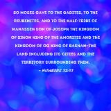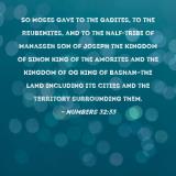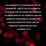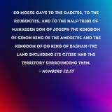 Pictures and Artwork So Moses gave to the Gadites, to the Reubenites, and to the half-tribe of Manasseh son of Joseph the kingdom of Sihon king of the Amorites and the kingdom of Og king of Bashan--the land including its cities and the territory surrounding them. |