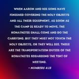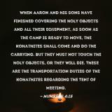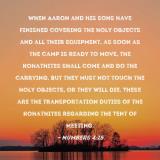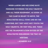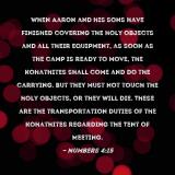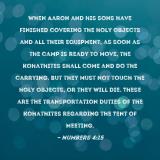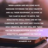 Pictures and Artwork When Aaron and his sons have finished covering the holy objects and all their equipment, as soon as the camp is ready to move, the Kohathites shall come and do the carrying. But they must not touch the holy objects, or they will die. These are the transportation duties of the Kohathites regarding the Tent of Meeting. |