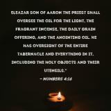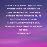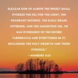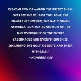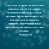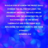 Pictures and Artwork Eleazar son of Aaron the priest shall oversee the oil for the light, the fragrant incense, the daily grain offering, and the anointing oil. He has oversight of the entire tabernacle and everything in it, including the holy objects and their utensils." |