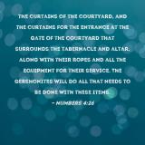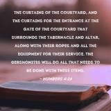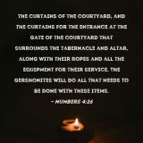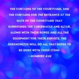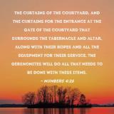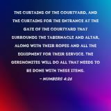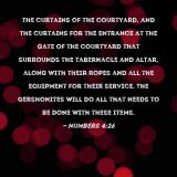 Pictures and Artwork the curtains of the courtyard, and the curtains for the entrance at the gate of the courtyard that surrounds the tabernacle and altar, along with their ropes and all the equipment for their service. The Gershonites will do all that needs to be done with these items. |