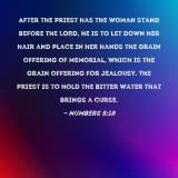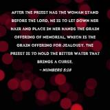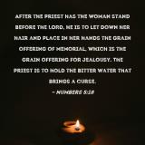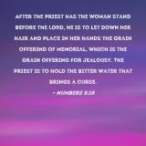 Pictures and Artwork After the priest has the woman stand before the LORD, he is to let down her hair and place in her hands the grain offering of memorial, which is the grain offering for jealousy. The priest is to hold the bitter water that brings a curse. |