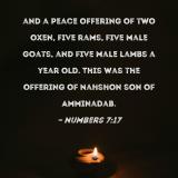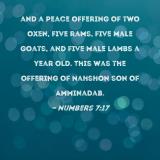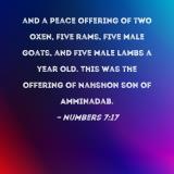 and a peace offering of two oxen, five rams, five male goats, and five male lambs a year old. This was the offering of Nahshon son of Amminadab.