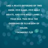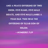 and a peace offering of two oxen, five rams, five male goats, and five male lambs a year old. This was the offering of Eliab son of Helon.