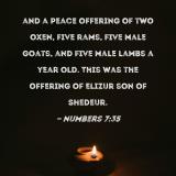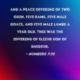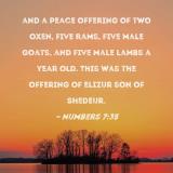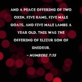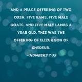 and a peace offering of two oxen, five rams, five male goats, and five male lambs a year old. This was the offering of Elizur son of Shedeur.