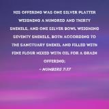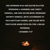 His offering was one silver platter weighing a hundred and thirty shekels, and one silver bowl weighing seventy shekels, both according to the sanctuary shekel and filled with fine flour mixed with oil for a grain offering;
