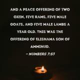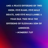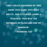 and a peace offering of two oxen, five rams, five male goats, and five male lambs a year old. This was the offering of Elishama son of Ammihud.