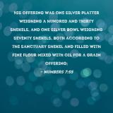 His offering was one silver platter weighing a hundred and thirty shekels, and one silver bowl weighing seventy shekels, both according to the sanctuary shekel and filled with fine flour mixed with oil for a grain offering;