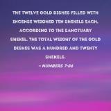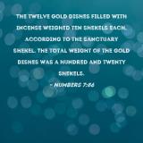 The twelve gold dishes filled with incense weighed ten shekels each, according to the sanctuary shekel. The total weight of the gold dishes was a hundred and twenty shekels.