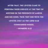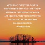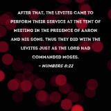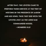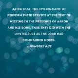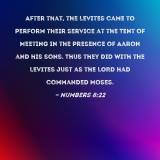 After that, the Levites came to perform their service at the Tent of Meeting in the presence of Aaron and his sons. Thus they did with the Levites just as the LORD had commanded Moses.