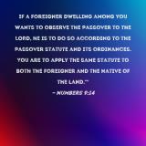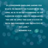 Pictures and Artwork If a foreigner dwelling among you wants to observe the Passover to the LORD, he is to do so according to the Passover statute and its ordinances. You are to apply the same statute to both the foreigner and the native of the land.'" |