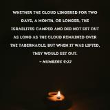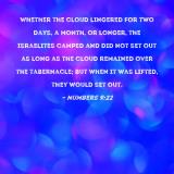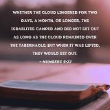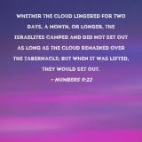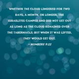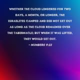 Whether the cloud lingered for two days, a month, or longer, the Israelites camped and did not set out as long as the cloud remained over the tabernacle; but when it was lifted, they would set out.