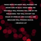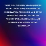 Those from the Negev will possess the mountains of Esau; those from the foothills will possess the land of the Philistines. They will occupy the fields of Ephraim and Samaria, and Benjamin will possess Gilead.