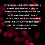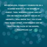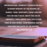 Pictures and Artwork Nevertheless, conduct yourselves in a manner worthy of the gospel of Christ. Then, whether I come and see you or only hear about you in my absence, I will know that you stand firm in one spirit, contending side by side for the faith of the gospel, |