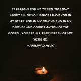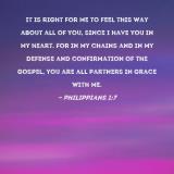 It is right for me to feel this way about all of you, since I have you in my heart. For in my chains and in my defense and confirmation of the gospel, you are all partners in grace with me.