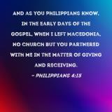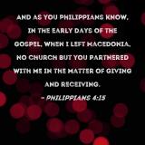 And as you Philippians know, in the early days of the gospel, when I left Macedonia, no church but you partnered with me in the matter of giving and receiving.