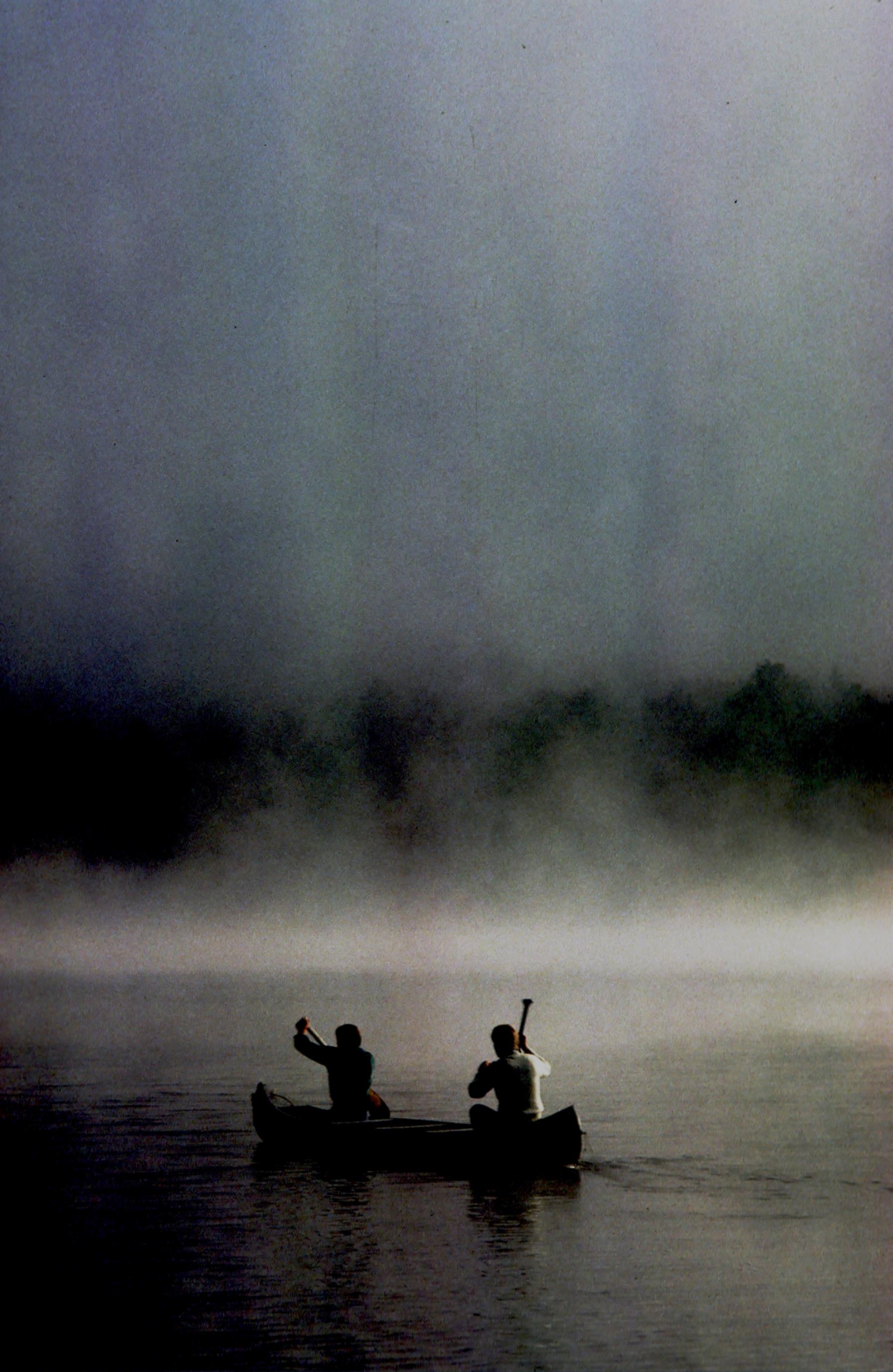 canoe; man; fish; fishing; fog; haze; vapor; boat; vessel; launch; canoes; men; fishes; fogs; hazes; vapors; boats; vessels; launches