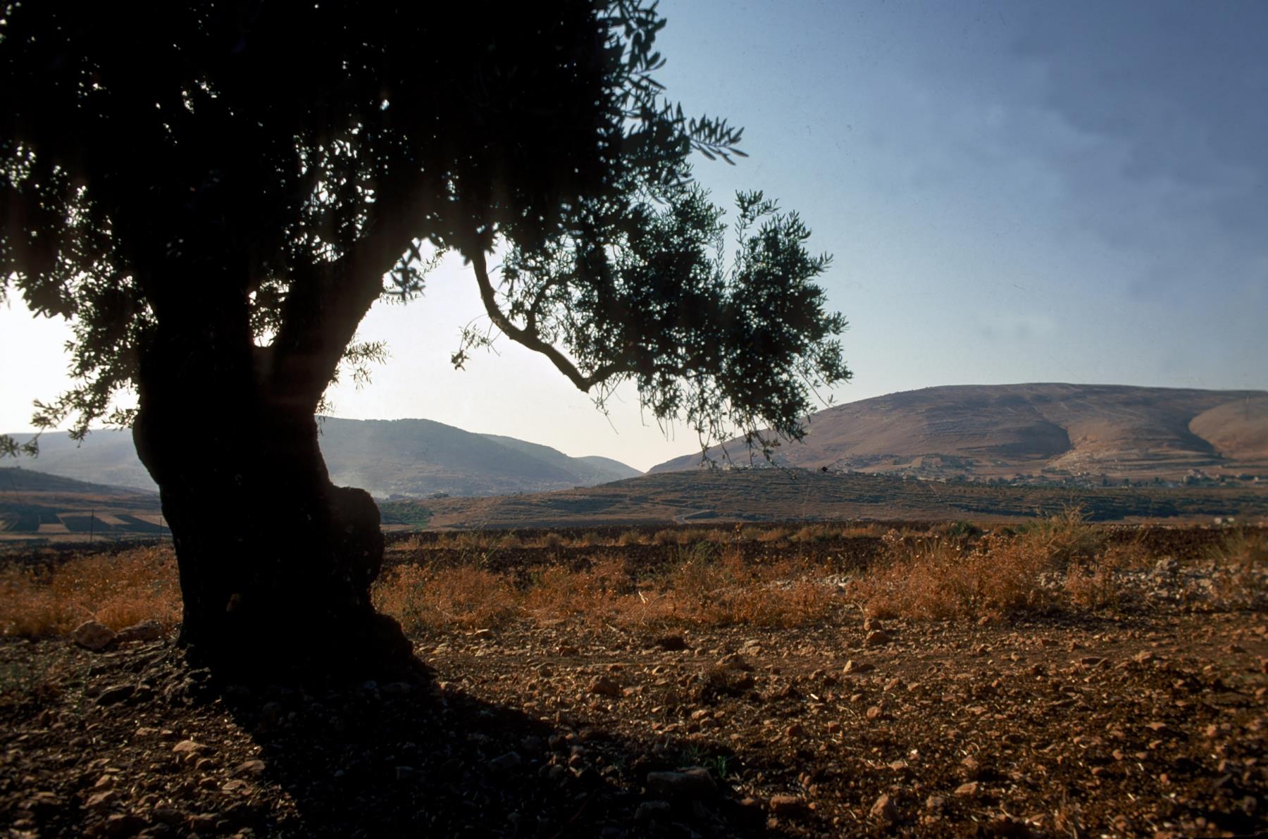 Mount Ebal on the left and Mount Gerizim on the right. In the valley between the two mountains lies the town of Nablus.
