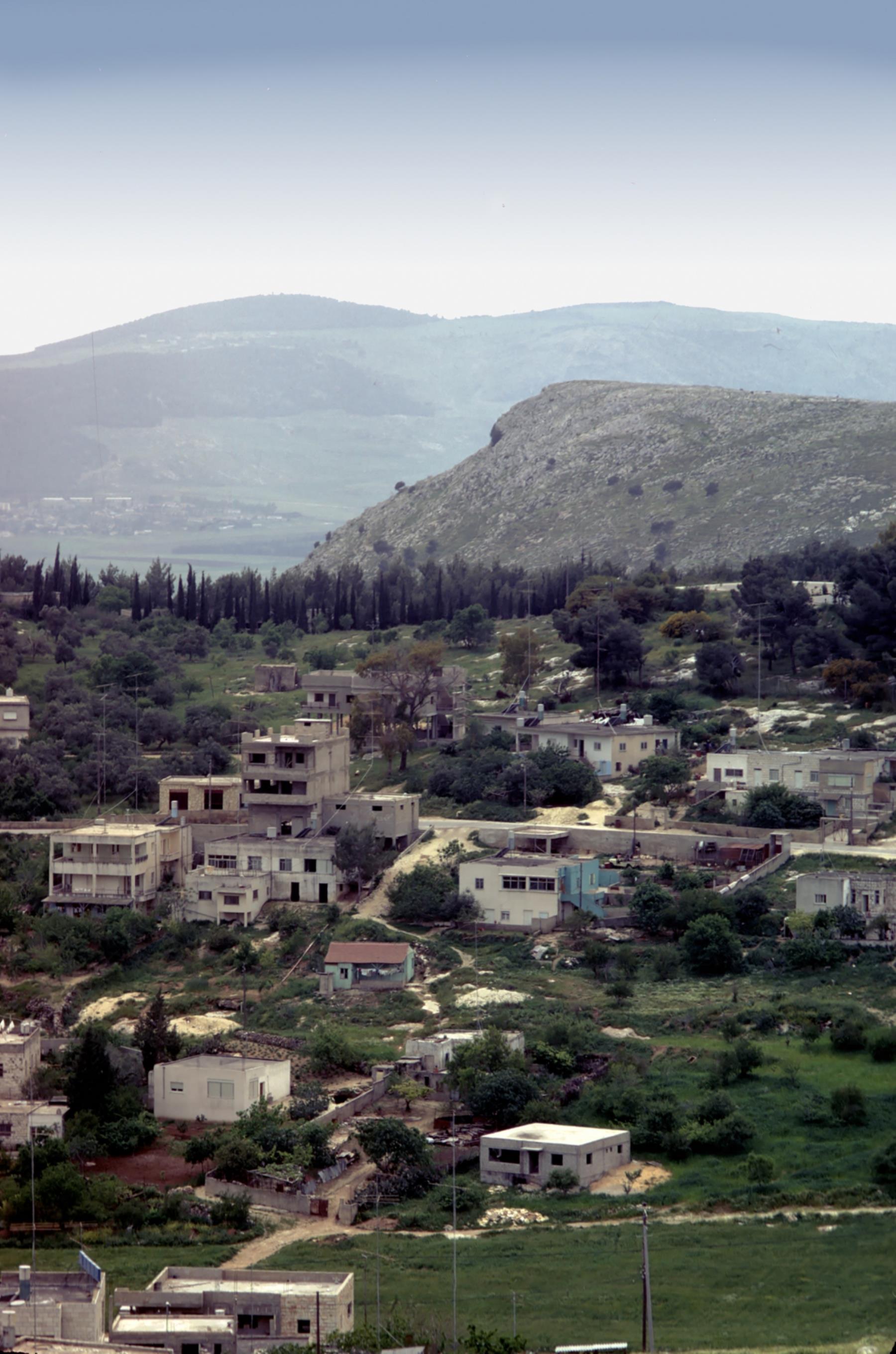The Mount of Precipitation, where the people of Nazareth tried to kill Jesus, is silhouetted against the more distant mountains.