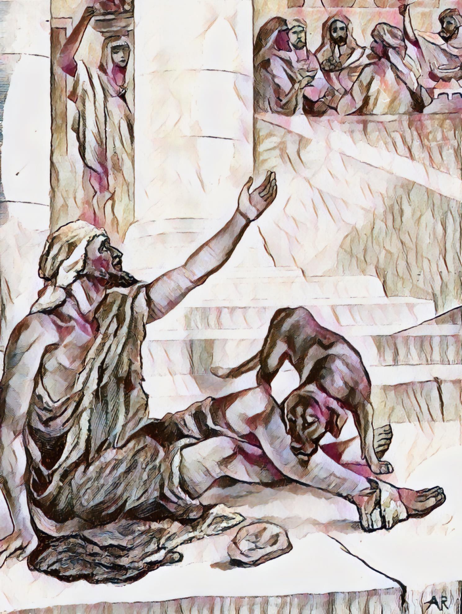 beggar; lazarus; rich; gate; dog; man; sore; poverty; riches; heaven; hell; beggars; gates; dogs; men; sores; poverties; heavens; hells