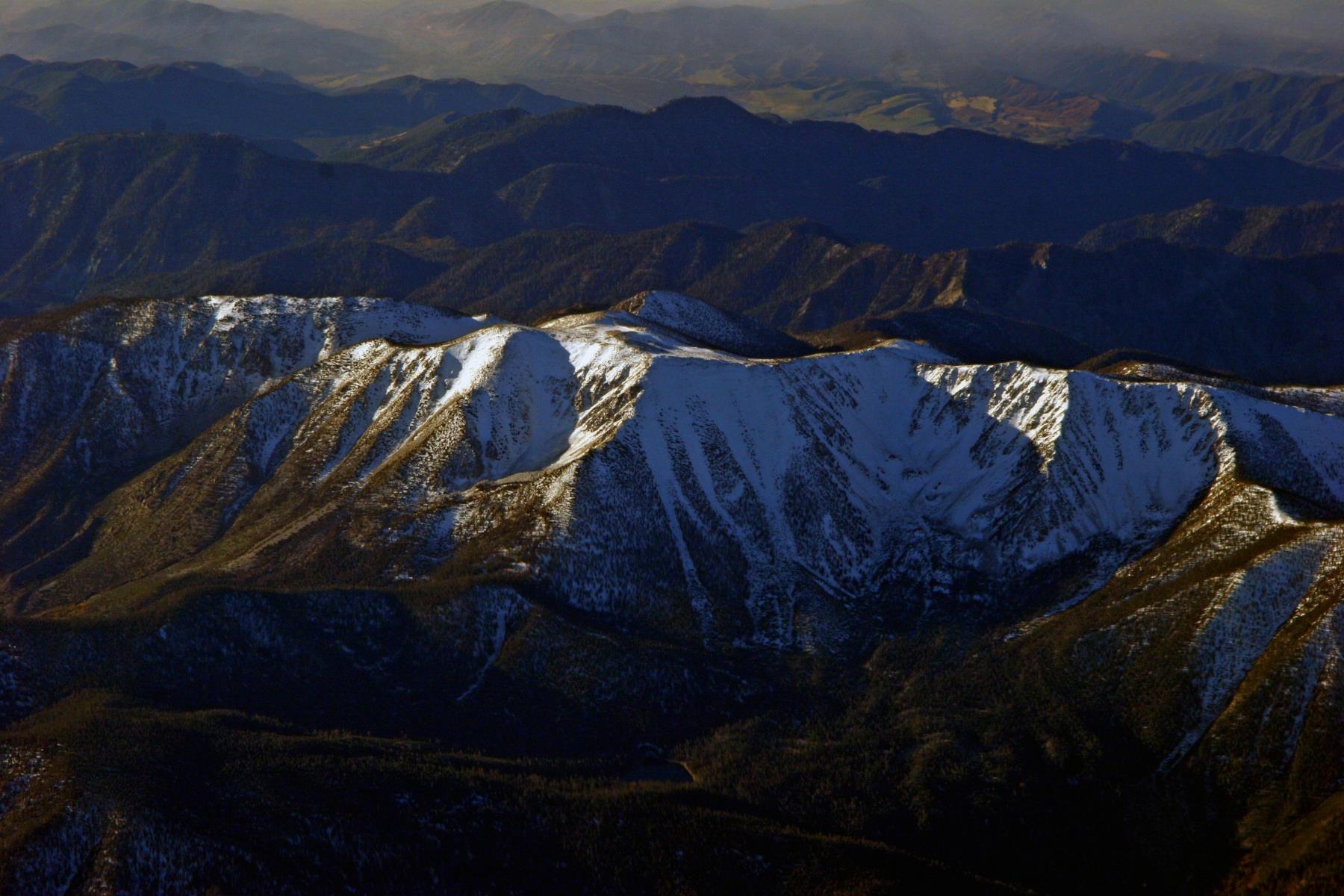 From thousands of feet above, snowcapped mountains of Colorado present a majestic sight of snow.