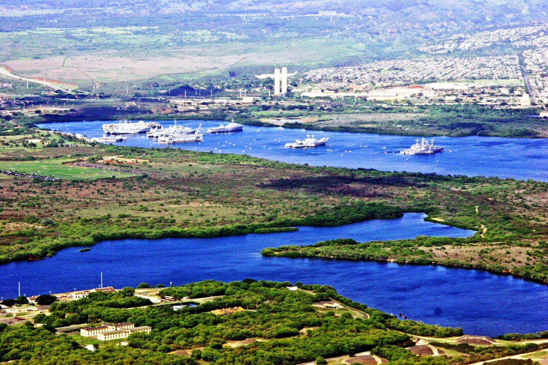 Pearl Harbor, Honolulu, Hawaii, and surrounding landscape from the air.