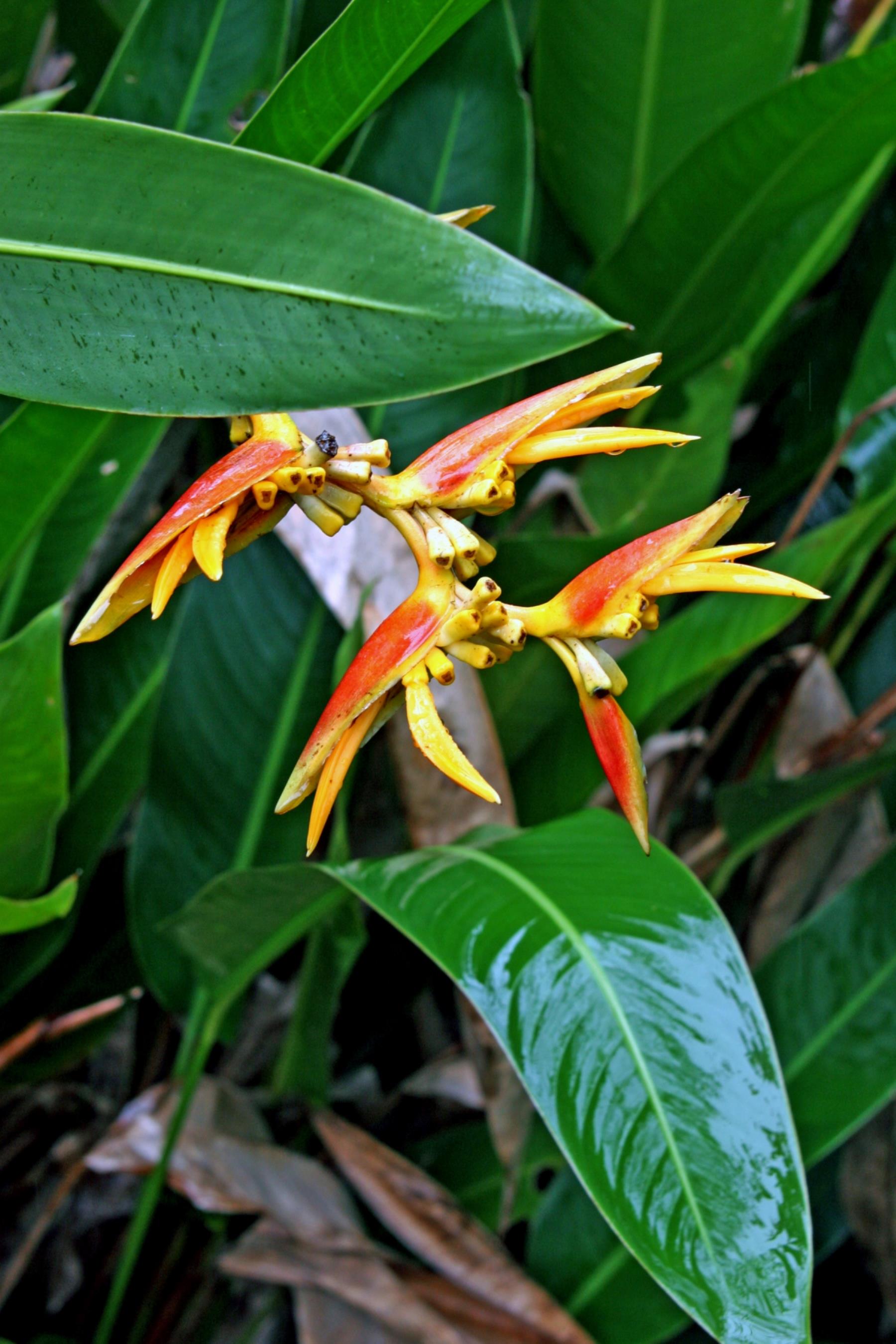 sassy; parrot's beak heliconia; heliconia; red and yellow flowers; red; yellow; nani mau botanical gardens; island of hawaii; hawaii; yellows