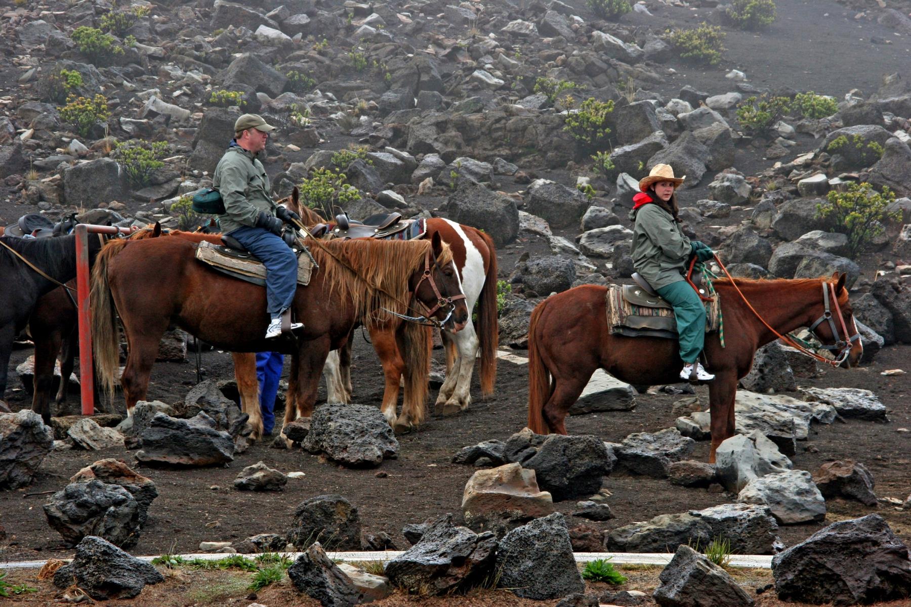 horse; rider; horseman; pu'u 'ula'ula summit; crater; caldera; extinct volcano; haleakala national park; maui; hawaii; horses; riders; horsemen; craters