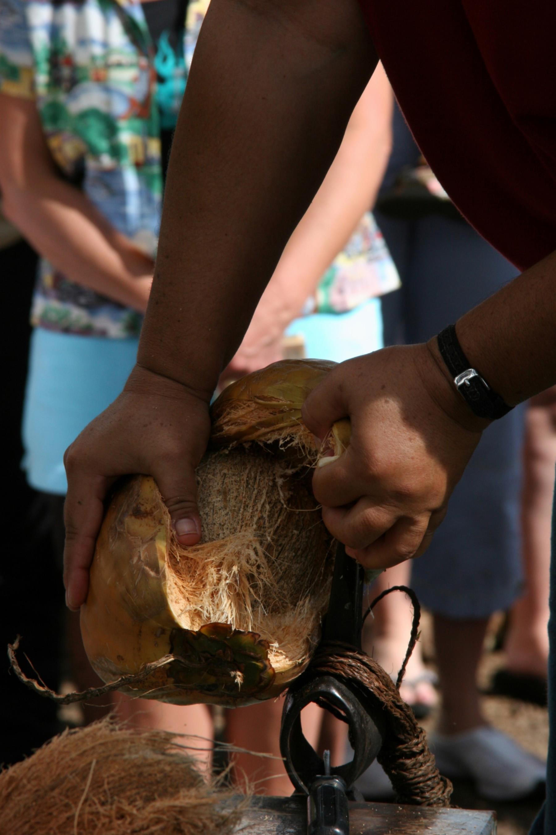 husking; husking a coconut; coconut; maui tropical plantation; maui; hawaii; coconuts